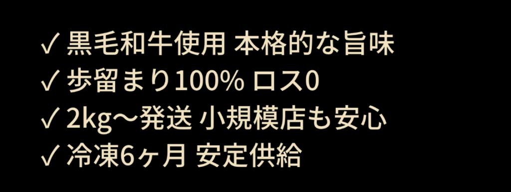 歩留まり率100%で実質コスト20%以上削減。中間業者カットの直接卸で業務用特別価格を実現。